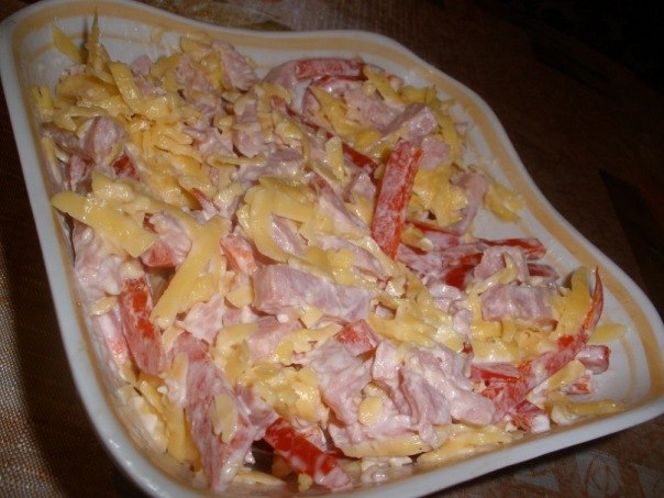 Ветчину и болгарский перец нарезать соломкой, сыр натереть на крупной тёрке, добавить майонез, перемешать.