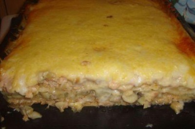 Сверху заливаем молочным соусом, посыпаем тертым сыром и запекаем в духовке около 30 -40 минут (до зарумянивания