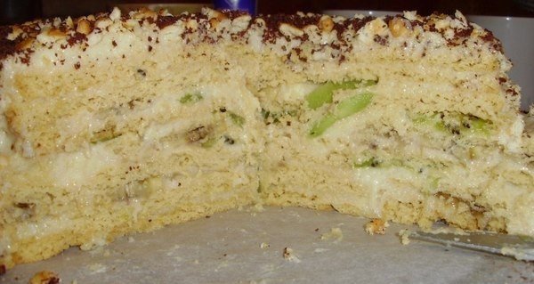 Уже во время сборки 4 средних коржа прослаиваем фруктами, чередуя:1 корж - киви, 1 корж - банан.