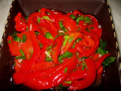 Перец запекаем в духовке до черной корочки( 10-15 мин на 220гр), горячим кладем в бумажный или пластиковый пакет, закрываем плотно и оставляем на 20-30 минут. После этого вынимаем, очищаем от шкурки и семян, и режем на полоски (я режу вдоль на полоски шириной 1,5-2 см, но это не принципиально).