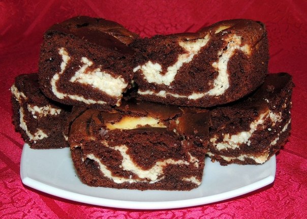 На медленном огне растопить масло и шоколад. Отдельно сбить яйца с сахаром до густой пены. Осторожно к яйцам влить растопленные масло и шоколад, хорошо перемешать. Муку размешать с разрыхлителем и насыпать в тесто. Получилось шоколадное тесто.Для творожной массы яйца, сахар и творог сбить. В форму смазанную маслом налить часть шоколадного теста. По верх него выложить в нескольких местах творожную массу. Сверху еще положить шоколадное тесто и творожную начинку. Взять деревянную шпажку для шашлычков ( можно заменить любой острой палочкой) и сделать разводы. Выпекать в разогретой духовке до 170 градусов, 50-60 минут.Остужать на решетке или в открытой духовке. Приятного аппетита!