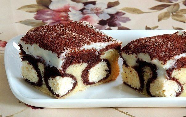 На остывший пирог выложить заварной крем и обсыпать порошком какао