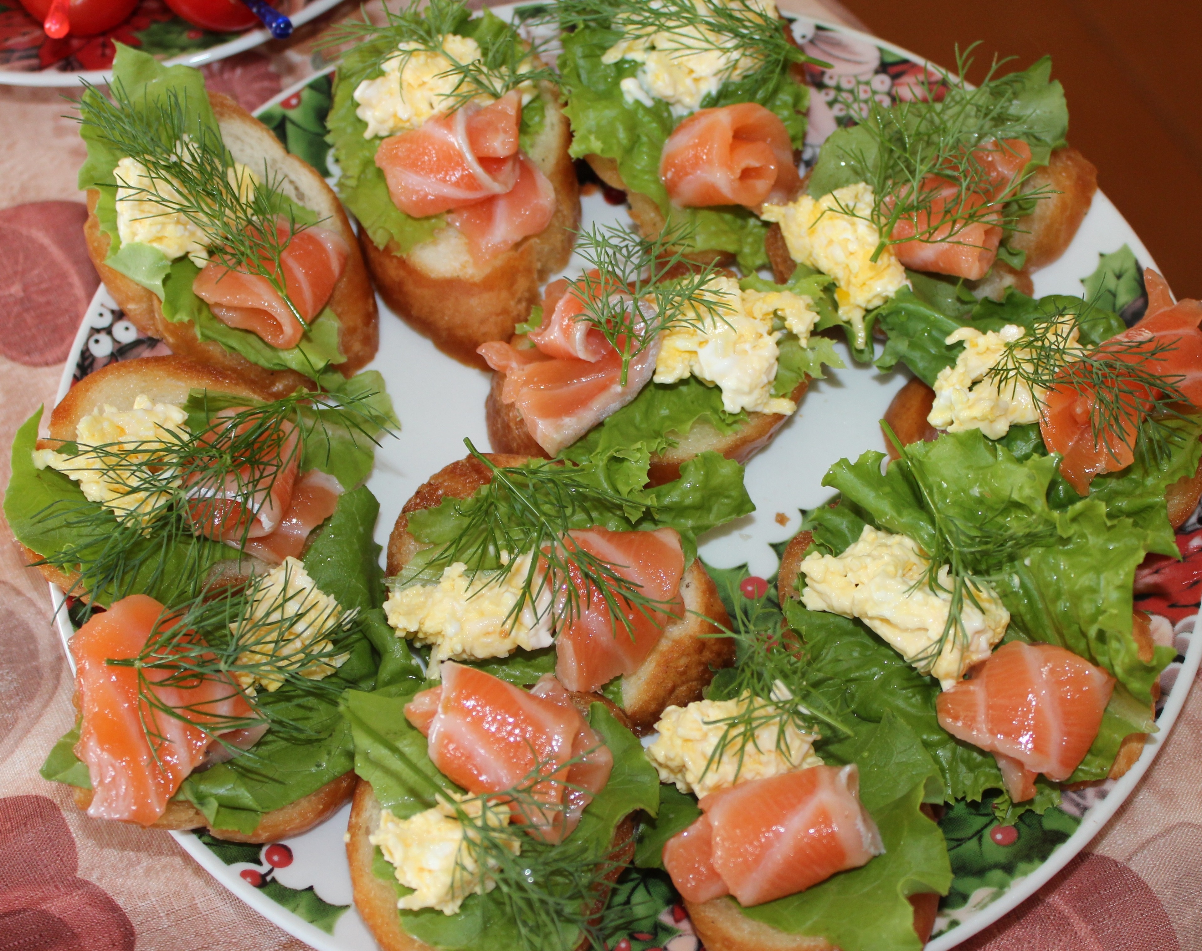 Красную рыбу нарезать на тонкие полоски. Каждый кусочек свернуть рулетиком. Украсить бутерброд получившейся розочкой из рыбы и зеленью.