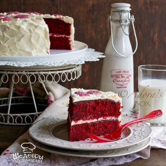8. Когда наши коржи полностью охладятся можно приступать к сборке. Прослаиваем каждый корх кремом, обмазываем им бока и вершину, сверху торт можно обыспать кокосовой стружкой или тертым белым шоколадом. Из этот теста можно приготовить не только торт, но и капкейки с кремовой шапочкой, время приготовления сократиться, ориентируйтесь на свою духовку.