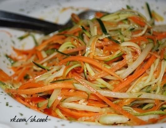 1. Овощи помыть, очистить. Огурец и морковь нарезать тонкими ленточками (овощечисткой).