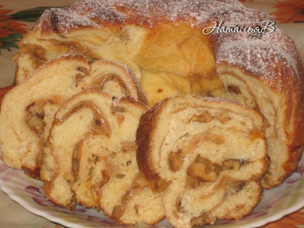 Затем тесто достать и, на присыпанной мукой рабочей поверхности, раскатать в прямоугольник толщиной 0.5см, смазать его вареной сгущенкой и посыпать толчеными орехами и скатать в рулет, уложить в круглую форму в виде кольца( у меня силиконовая для кекса), соединить концы, накрыть полотенцем и поставить в теплое место на 1 час для расстойки. Выпекать в духовке сначала 10 минут при 200 градусов, затем 30минут при 180. Готовый сдобыш охладить на решетке, посыпать сахарной пудрой и нарезать на порционные кусочки, Приятного аппетита!