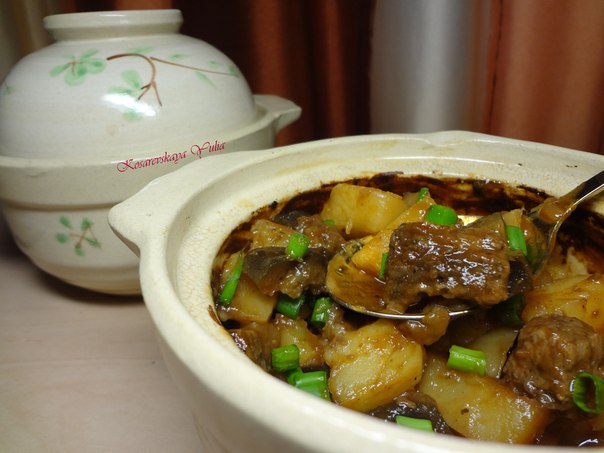 Овощи почистим, помоем и нарежем кубиками. Говядину помоем, обсушим и нарежем небольшими кусочками. Выложим в горшочки слоями, посолим и приправим хмели-сунели каждый слой. Снизу верх: картофель, мяса, баклажаны, лук и помидоры. Вольем в каждый горшочек немного воды разведенной с томатной пастой (можно томатный сок) и добавим толчёный чеснок. Тушим при 200С в течение получаса. Затем убавим до 180С и ещё 1,5 часа. Затем добавим зелень и подадим на стол. Приятного аппетита!