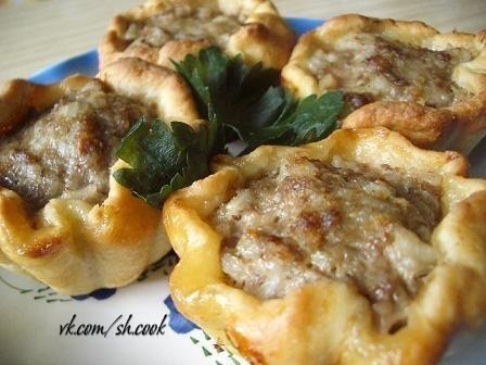 В картофельные корзиночки выложить по столовой ложке фарша, посыпать тёртым сыром.