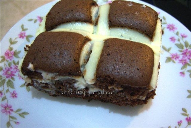 Творожная масса утопает в шоколадном и шоколадное тесто поднимается, образуя "подушечки". Вкус нежный, сочный.