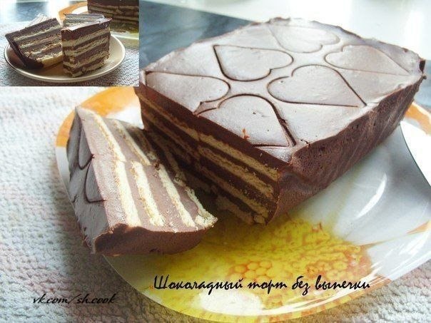 Форму (желательно не круглую) выстилаем пленкой и выкладываем первый слой печень. Дальше крем, опять печенье и т.д. ставим торт в холодильник для застывания.