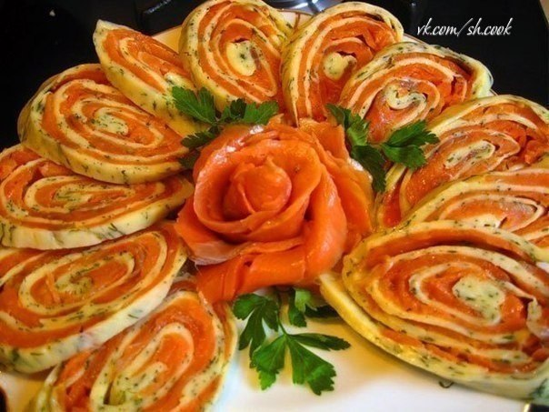 4. Верхнюю пленку снимаем и выкладываем на пласт раскатанного сыра рыбу и сворачиваем в рулет. Готовый рулет убираем на полчаса в холодильник. Затем снимаем пленку, нарезаем по диагонали выкладываем на блюдо и украшаем.