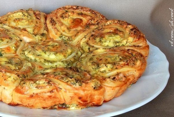 Тесто разморозить, раскатать в пласт толщиной примерно 3 мм. На тесто равномерно намазать начинку. Свернуть пласт теста с начинкой в довольно плотный рулет. Нарезать рулет поперек на 8 кусков.