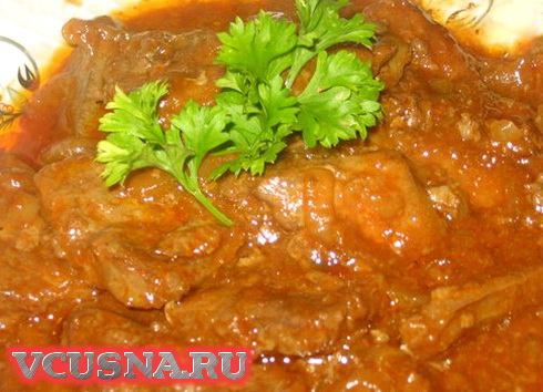 Печень выкладываем аккуратно на разогретую сковородку с подсолнечным маслом, по пару минут обжариваем с каждой стороны, добавляем лук, жарим еще пару минут (все на средне-большом огне).Добавляем соус(можно еще 50-100 мл кипяточка) и на медленном огне томим минут 5-7. Выключаем, даем настояться и наслаждаемся.