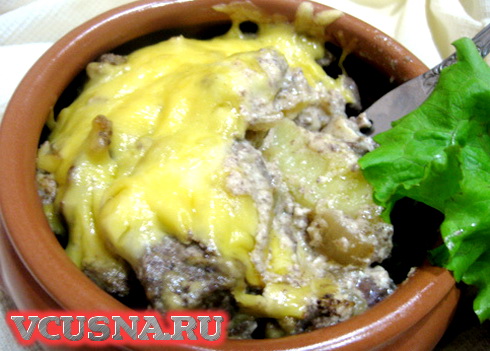 В горшочки выложить вначале печень, поверх печени - картошку , картофель накрыть печенью и посыпать сыром. Выпекать при температуре 180 градусов 30 минут, горшочек крышкой не накрывать.