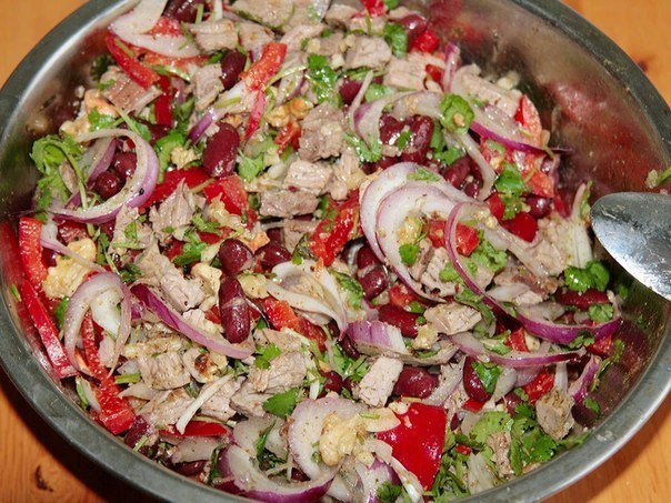 Из банки фасоли сливаем воду и промываем её. Добавляем лук, говядину, перцы, чеснок, порезанную кинзу, обжаренные и мелко порубленные грецкие орехи.