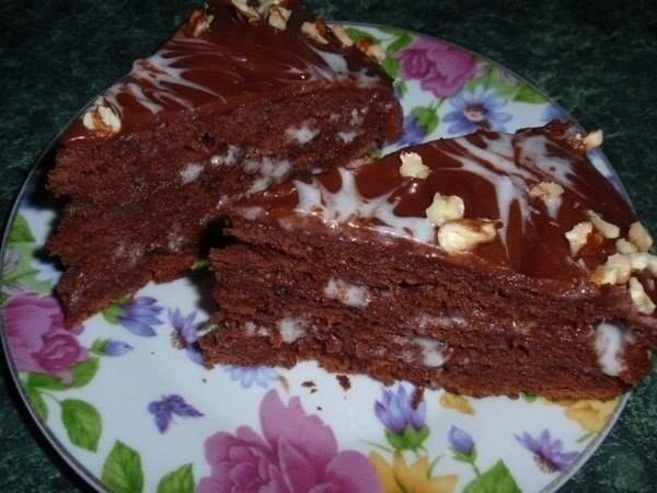 Верх порываем глазурью: 1 ст.л какао, 1 ст.л сметаны, 1 ст.л сахара, 1 ст.л сл. масла- все разогреть, хорошо растереть до однородной консистенции и быстро залить торт.